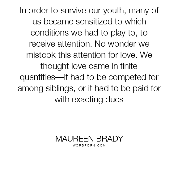 In order to survive our youth, many of us became sensitized to which conditions we had to play to, to receive attention. No wonder we mistook this attention for love. We thought love came in finite quantities—it had to be competed for among siblings, or it had to be paid for with exacting dues