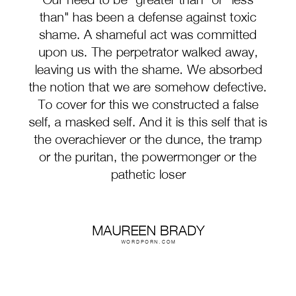 Our need to be "greater than" or "less than" has been a defense against toxic shame. A shameful act was committed upon us. The perpetrator walked away, leaving us with the shame. We absorbed the notion that we are somehow defective. To cover for this we constructed a false self, a masked self. And it is this self that is the overachiever or the dunce, the tramp or the puritan, the powermonger or the pathetic loser