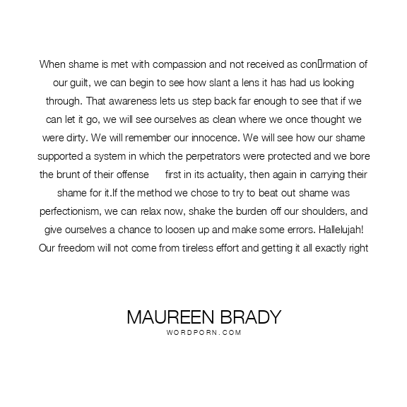 When shame is met with compassion and not received as confirmation of our guilt, we can begin to see how slant a lens it has had us looking through. That awareness lets us step back far enough to see that if we can let it go, we will see ourselves as clean where we once thought we were dirty. We will remember our innocence. We will see how our shame supported a system in which the perpetrators were protected and we bore the brunt of their offense — first in its actuality, then again in carrying their shame for it.If the method we chose to try to beat out shame was perfectionism, we can relax now, shake the burden off our shoulders, and give ourselves a chance to loosen up and make some errors. Hallelujah! Our freedom will not come from tireless effort and getting it all exactly right
