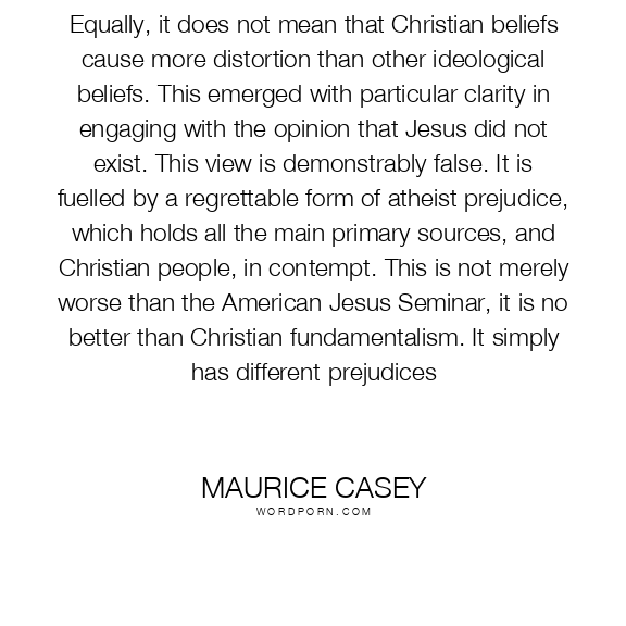 Equally, it does not mean that Christian beliefs cause more distortion than other ideological beliefs. This emerged with particular clarity in engaging with the opinion that Jesus did not exist. This view is demonstrably false. It is fuelled by a regrettable form of atheist prejudice, which holds all the main primary sources, and Christian people, in contempt. This is not merely worse than the American Jesus Seminar, it is no better than Christian fundamentalism. It simply has different prejudices