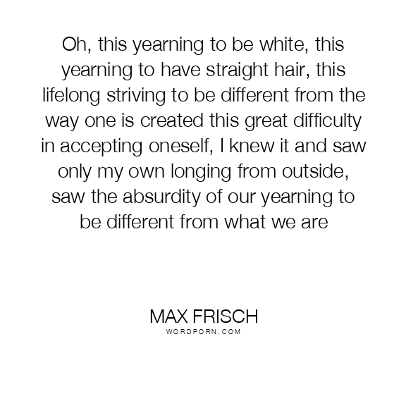 Oh, this yearning to be white, this yearning to have straight hair, this lifelong striving to be different from the way one is created this great difficulty in accepting oneself, I knew it and saw only my own longing from outside, saw the absurdity of our yearning to be different from what we are