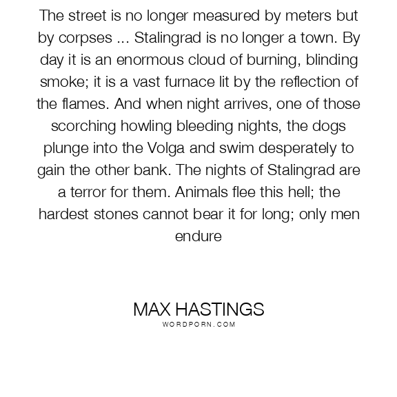 The street is no longer measured by meters but by corpses ... Stalingrad is no longer a town. By day it is an enormous cloud of burning, blinding smoke; it is a vast furnace lit by the reflection of the flames. And when night arrives, one of those scorching howling bleeding nights, the dogs plunge into the Volga and swim desperately to gain the other bank. The nights of Stalingrad are a terror for them. Animals flee this hell; the hardest stones cannot bear it for long; only men endure