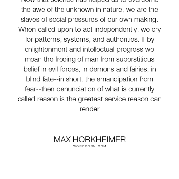 Now that science has helped us to overcome the awe of the unknown in nature, we are the slaves of social pressures of our own making. When called upon to act independently, we cry for patterns, systems, and authorities. If by enlightenment and intellectual progress we mean the freeing of man from superstitious belief in evil forces, in demons and fairies, in blind fate--in short, the emancipation from fear--then denunciation of what is currently called reason is the greatest service reason can render