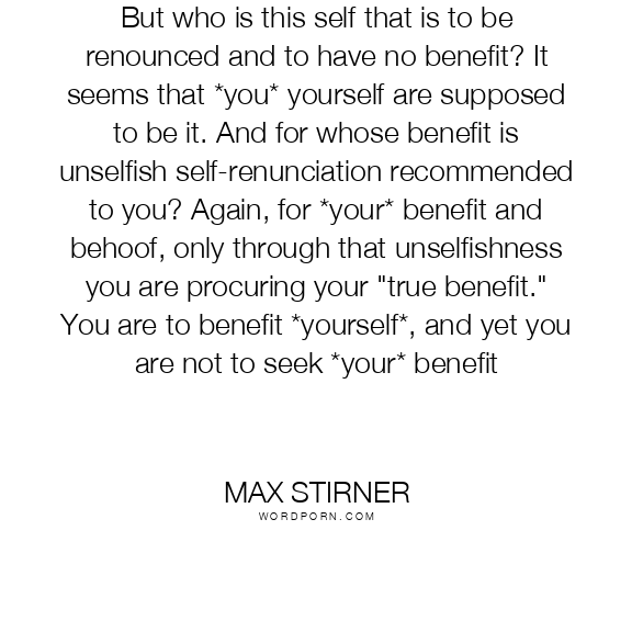 But who is this self that is to be renounced and to have no benefit? It seems that *you* yourself are supposed to be it. And for whose benefit is unselfish self-renunciation recommended to you? Again, for *your* benefit and behoof, only through that unselfishness you are procuring your "true benefit." You are to benefit *yourself*, and yet you are not to seek *your* benefit