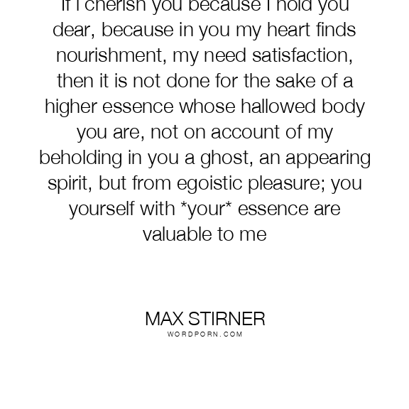 If i cherish you because I hold you dear, because in you my heart finds nourishment, my need satisfaction, then it is not done for the sake of a higher essence whose hallowed body you are, not on account of my beholding in you a ghost, an appearing spirit, but from egoistic pleasure; you yourself with *your* essence are valuable to me