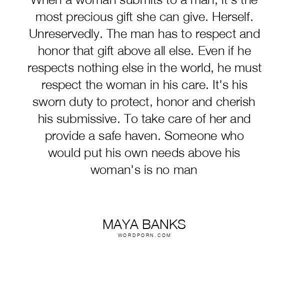 When a woman submits to a man, it's the most precious gift she can give. Herself. Unreservedly. The man has to respect and honor that gift above all else. Even if he respects nothing else in the world, he must respect the woman in his care. It's his sworn duty to protect, honor and cherish his submissive. To take care of her and provide a safe haven. Someone who would put his own needs above his woman's is no man