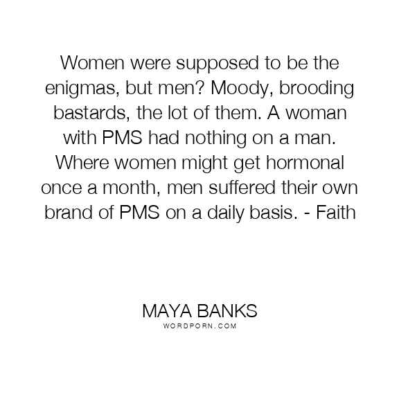Women were supposed to be the enigmas, but men? Moody, brooding bastards, the lot of them. A woman with PMS had nothing on a man. Where women might get hormonal once a month, men suffered their own brand of PMS on a daily basis. - Faith