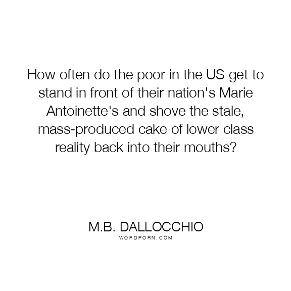 How often do the poor in the US get to stand in front of their nation's Marie Antoinette's and shove the stale, mass-produced cake of lower class reality back into their mouths?