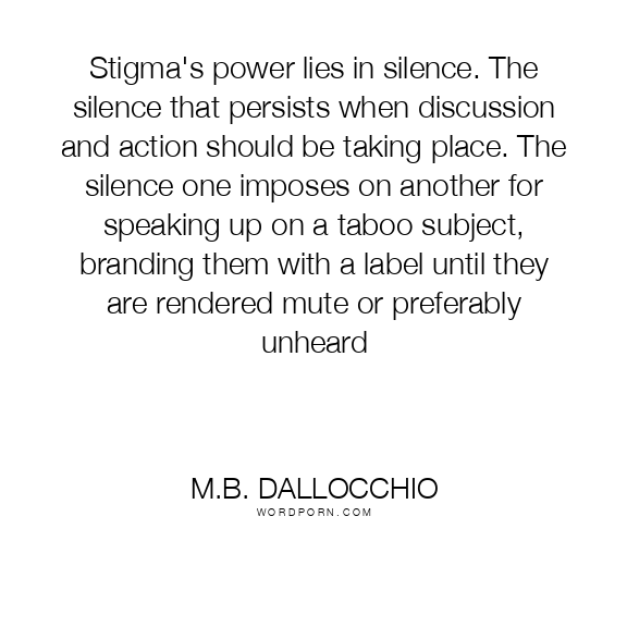 Stigma's power lies in silence. The silence that persists when discussion and action should be taking place. The silence one imposes on another for speaking up on a taboo subject, branding them with a label until they are rendered mute or preferably unheard
