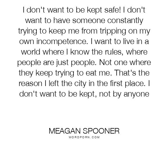 I don't want to be kept safe! I don't want to have someone constantly trying to keep me from tripping on my own incompetence. I want to live in a world where I know the rules, where people are just people. Not one where they keep trying to eat me. That's the reason I left the city in the first place. I don't want to be kept, not by anyone