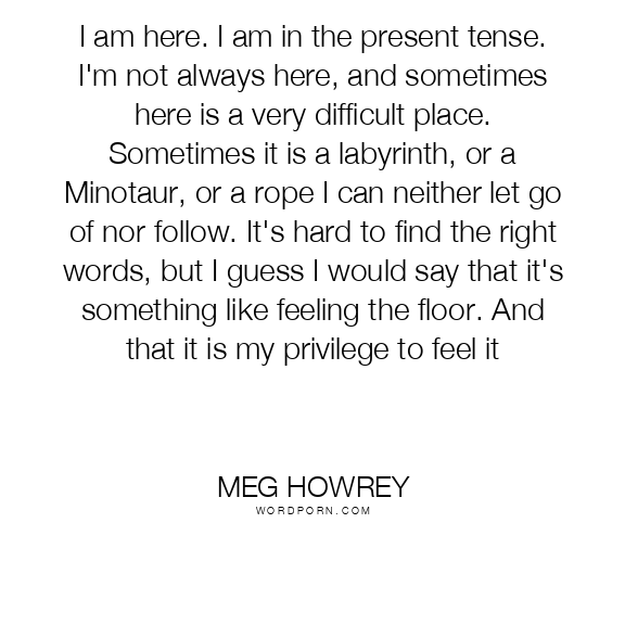 I am here. I am in the present tense. I'm not always here, and sometimes here is a very difficult place. Sometimes it is a labyrinth, or a Minotaur, or a rope I can neither let go of nor follow. It's hard to find the right words, but I guess I would say that it's something like feeling the floor. And that it is my privilege to feel it