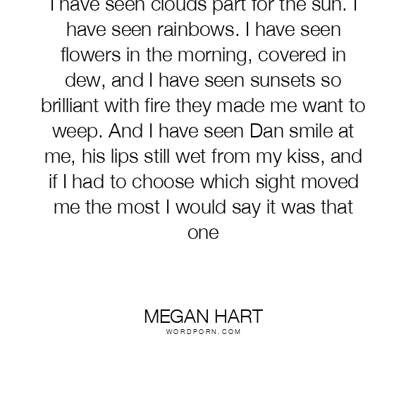 I have seen clouds part for the sun. I have seen rainbows. I have seen flowers in the morning, covered in dew, and I have seen sunsets so brilliant with fire they made me want to weep. And I have seen Dan smile at me, his lips still wet from my kiss, and if I had to choose which sight moved me the most I would say it was that one
