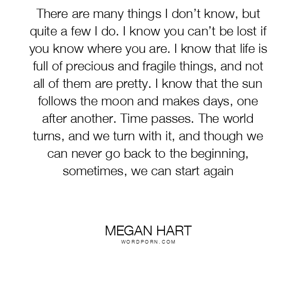 There are many things I don’t know, but quite a few I do. I know you can’t be lost if you know where you are. I know that life is full of precious and fragile things, and not all of them are pretty. I know that the sun follows the moon and makes days, one after another. Time passes. The world turns, and we turn with it, and though we can never go back to the beginning, sometimes, we can start again