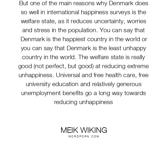 But one of the main reasons why Denmark does so well in international happiness surveys is the welfare state, as it reduces uncertainty, worries and stress in the population. You can say that Denmark is the happiest country in the world or you can say that Denmark is the least unhappy country in the world. The welfare state is really good (not perfect, but good) at reducing extreme unhappiness. Universal and free health care, free university education and relatively generous unemployment benefits go a long way towards reducing unhappiness