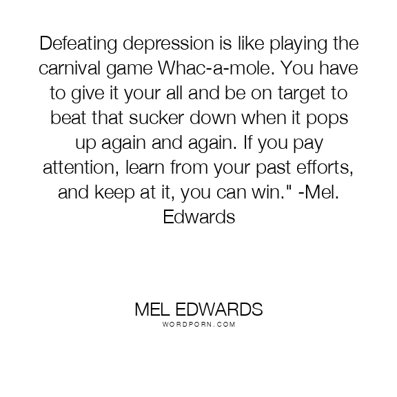 Defeating depression is like playing the carnival game Whac-a-mole. You have to give it your all and be on target to beat that sucker down when it pops up again and again. If you pay attention, learn from your past efforts, and keep at it, you can win." -Mel. Edwards
