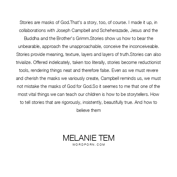 Stories are masks of God.That's a story, too, of course. I made it up, in collaborations with Joseph Campbell and Scheherazade, Jesus and the Buddha and the Brother's Grimm.Stories show us how to bear the unbearable, approach the unapproachable, conceive the inconceiveable. Stories provide meaning, texture, layers and layers of truth.Stories can also trivialize. Offered indelicately, taken too literally, stories become reductionist tools, rendering things neat and therefore false. Even as we must revere and cherish the masks we variously create, Campbell reminds us, we must not mistake the masks of God for God.So it seemes to me that one of the most vital things we can teach our children is how to be storytellers. How to tell stories that are rigorously, insistently, beautifully true. And how to believe them