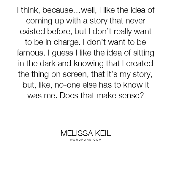 I think, because…well, I like the idea of coming up with a story that never existed before, but I don’t really want to be in charge. I don’t want to be famous. I guess I like the idea of sitting in the dark and knowing that I created the thing on screen, that it’s my story, but, like, no-one else has to know it was me. Does that make sense?