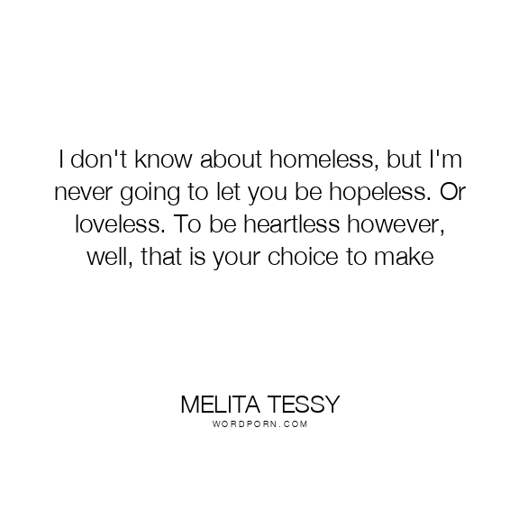 I don't know about homeless, but I'm never going to let you be hopeless. Or loveless. To be heartless however, well, that is your choice to make