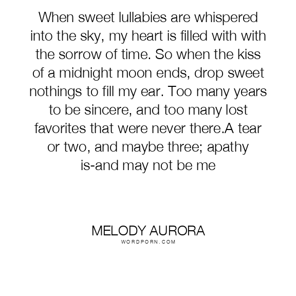 When sweet lullabies are whispered into the sky, my heart is filled with with the sorrow of time. So when the kiss of a midnight moon ends, drop sweet nothings to fill my ear. Too many years to be sincere, and too many lost favorites that were never there.A tear or two, and maybe three; apathy is-and may not be me