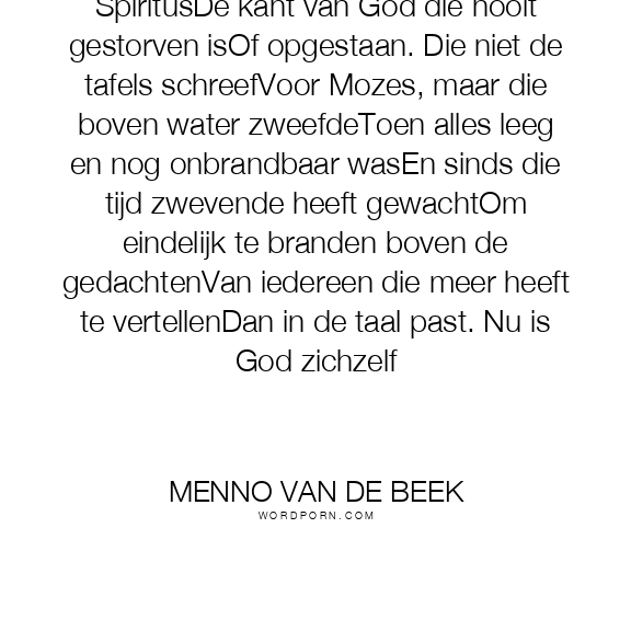 SpiritusDe kant van God die nooit gestorven isOf opgestaan. Die niet de tafels schreefVoor Mozes, maar die boven water zweefdeToen alles leeg en nog onbrandbaar wasEn sinds die tijd zwevende heeft gewachtOm eindelijk te branden boven de gedachtenVan iedereen die meer heeft te vertellenDan in de taal past. Nu is God zichzelf
