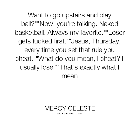 Want to go upstairs and play ball?""Now, you're talking. Naked basketball. Always my favorite.""Loser gets fucked first.""Jesus, Thursday, every time you set that rule you cheat.""What do you mean, I cheat? I usually lose.""That's exactly what I mean