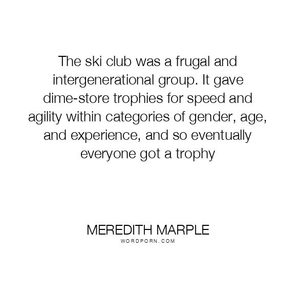 The ski club was a frugal and intergenerational group. It gave dime-store trophies for speed and agility within categories of gender, age, and experience, and so eventually everyone got a trophy
