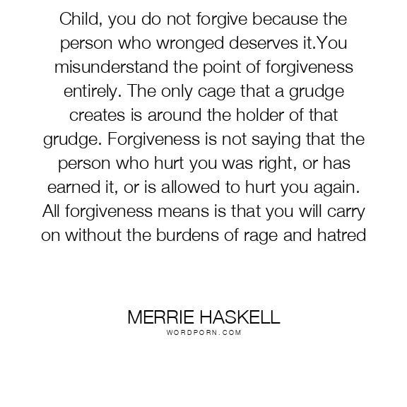 Child, you do not forgive because the person who wronged deserves it.You misunderstand the point of forgiveness entirely. The only cage that a grudge creates is around the holder of that grudge. Forgiveness is not saying that the person who hurt you was right, or has earned it, or is allowed to hurt you again. All forgiveness means is that you will carry on without the burdens of rage and hatred