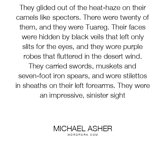 They glided out of the heat-haze on their camels like specters. There were twenty of them, and they were Tuareg. Their faces were hidden by black veils that left only slits for the eyes, and they wore purple robes that fluttered in the desert wind. They carried swords, muskets and seven-foot iron spears, and wore stilettos in sheaths on their left forearms. They were an impressive, sinister sight
