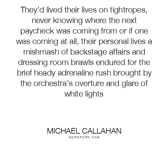 They'd lived their lives on tightropes, never knowing where the next paycheck was coming from or if one was coming at all, their personal lives a mishmash of backstage affairs and dressing room brawls endured for the brief heady adrenaline rush brought by the orchestra's overture and glare of white lights