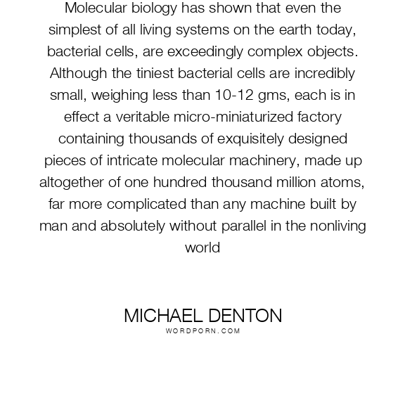 Molecular biology has shown that even the simplest of all living systems on the earth today, bacterial cells, are exceedingly complex objects. Although the tiniest bacterial cells are incredibly small, weighing less than 10-12 gms, each is in effect a veritable micro-miniaturized factory containing thousands of exquisitely designed pieces of intricate molecular machinery, made up altogether of one hundred thousand million atoms, far more complicated than any machine built by man and absolutely without parallel in the nonliving world