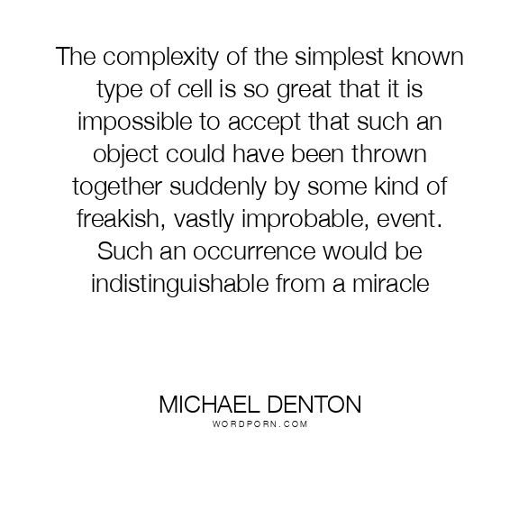 The complexity of the simplest known type of cell is so great that it is impossible to accept that such an object could have been thrown together suddenly by some kind of freakish, vastly improbable, event. Such an occurrence would be indistinguishable from a miracle