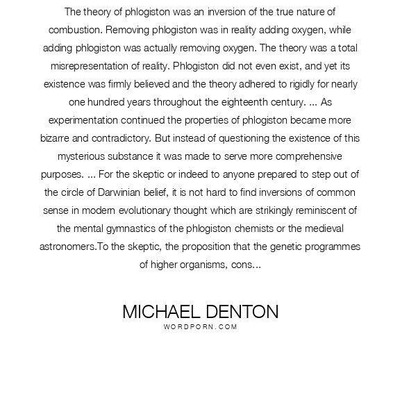 The theory of phlogiston was an inversion of the true nature of combustion. Removing phlogiston was in reality adding oxygen, while adding phlogiston was actually removing oxygen. The theory was a total misrepresentation of reality. Phlogiston did not even exist, and yet its existence was firmly believed and the theory adhered to rigidly for nearly one hundred years throughout the eighteenth century. ... As experimentation continued the properties of phlogiston became more bizarre and contradictory. But instead of questioning the existence of this mysterious substance it was made to serve more comprehensive purposes. ... For the skeptic or indeed to anyone prepared to step out of the circle of Darwinian belief, it is not hard to find inversions of common sense in modern evolutionary thought which are strikingly reminiscent of the mental gymnastics of the phlogiston chemists or the medieval astronomers.To the skeptic, the proposition that the genetic programmes of higher organisms, consisting of something close to a thousand million bits of information, equivalent to the sequence of letters in a small library of one thousand volumes, containing in encoded form countless thousands of intricate algorithms controlling, specifying and ordering the growth and development of billions and billions of cells into the form of a complex organism, were composed by a purely random process is simply an affront to reason. But to the Darwinist the idea is accepted without a ripple of doubt - the paradigm takes precedence!