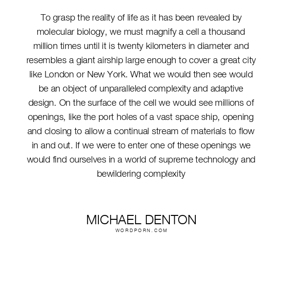 To grasp the reality of life as it has been revealed by molecular biology, we must magnify a cell a thousand million times until it is twenty kilometers in diameter and resembles a giant airship large enough to cover a great city like London or New York. What we would then see would be an object of unparalleled complexity and adaptive design. On the surface of the cell we would see millions of openings, like the port holes of a vast space ship, opening and closing to allow a continual stream of materials to flow in and out. If we were to enter one of these openings we would find ourselves in a world of supreme technology and bewildering complexity