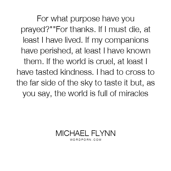 For what purpose have you prayed?""For thanks. If I must die, at least I have lived. If my companions have perished, at least I have known them. If the world is cruel, at least I have tasted kindness. I had to cross to the far side of the sky to taste it but, as you say, the world is full of miracles