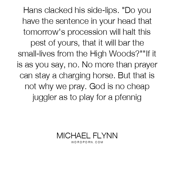 Hans clacked his side-lips. "Do you have the sentence in your head that tomorrow's procession will halt this pest of yours, that it will bar the small-lives from the High Woods?""If it is as you say, no. No more than prayer can stay a charging horse. But that is not why we pray. God is no cheap juggler as to play for a pfennig