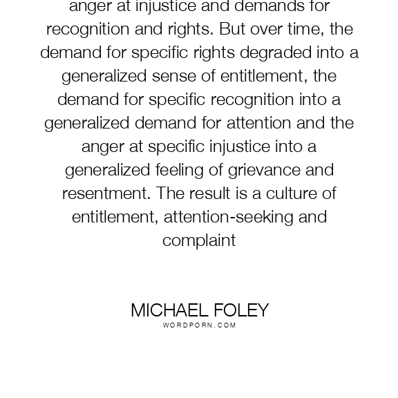 The 1970s was the decade of liberation, of anger at injustice and demands for recognition and rights. But over time, the demand for specific rights degraded into a generalized sense of entitlement, the demand for specific recognition into a generalized demand for attention and the anger at specific injustice into a generalized feeling of grievance and resentment. The result is a culture of entitlement, attention-seeking and complaint