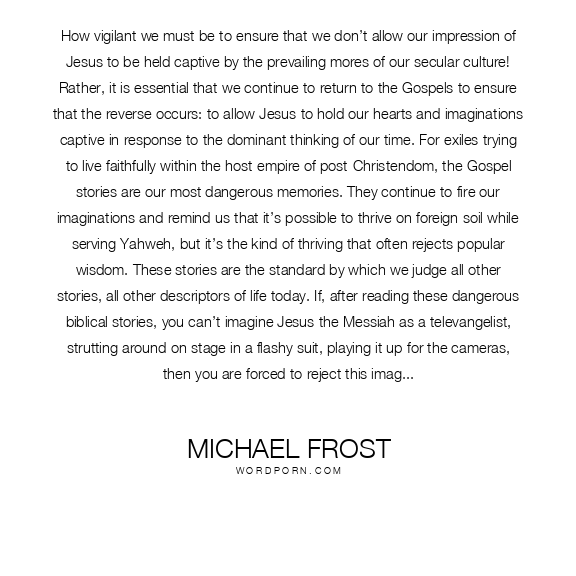 How vigilant we must be to ensure that we don’t allow our impression of Jesus to be held captive by the prevailing mores of our secular culture! Rather, it is essential that we continue to return to the Gospels to ensure that the reverse occurs: to allow Jesus to hold our hearts and imaginations captive in response to the dominant thinking of our time. For exiles trying to live faithfully within the host empire of post-Christendom, the Gospel stories are our most dangerous memories. They continue to fire our imaginations and remind us that it’s possible to thrive on foreign soil while serving Yahweh, but it’s the kind of thriving that often rejects popular wisdom. These stories are the standard by which we judge all other stories, all other descriptors of life today. If, after reading these dangerous biblical stories, you can’t imagine Jesus the Messiah as a televangelist, strutting around on stage in a flashy suit, playing it up for the cameras, then you are forced to reject this image and seek another mode of being Christ today