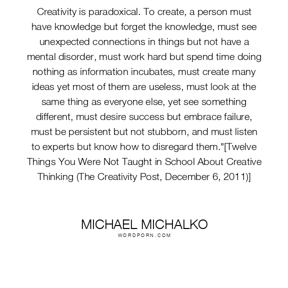 Creativity is paradoxical. To create, a person must have knowledge but forget the knowledge, must see unexpected connections in things but not have a mental disorder, must work hard but spend time doing nothing as information incubates, must create many ideas yet most of them are useless, must look at the same thing as everyone else, yet see something different, must desire success but embrace failure, must be persistent but not stubborn, and must listen to experts but know how to disregard them."[Twelve Things You Were Not Taught in School About Creative Thinking (The Creativity Post, December 6, 2011)]
