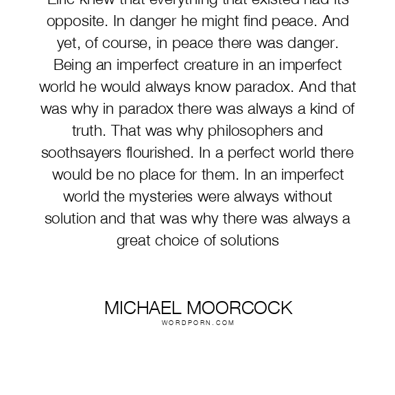 Elric knew that everything that existed had its opposite. In danger he might find peace. And yet, of course, in peace there was danger. Being an imperfect creature in an imperfect world he would always know paradox. And that was why in paradox there was always a kind of truth. That was why philosophers and soothsayers flourished. In a perfect world there would be no place for them. In an imperfect world the mysteries were always without solution and that was why there was always a great choice of solutions