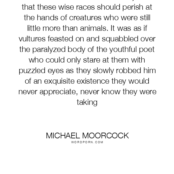 Therefore it seemed a dreadful injustice that these wise races should perish at the hands of creatures who were still little more than animals. It was as if vultures feasted on and squabbled over the paralyzed body of the youthful poet who could only stare at them with puzzled eyes as they slowly robbed him of an exquisite existence they would never appreciate, never know they were taking