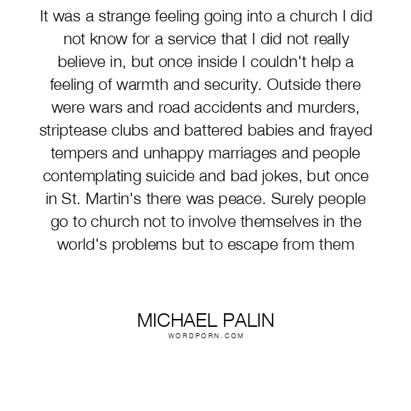 It was a strange feeling going into a church I did not know for a service that I did not really believe in, but once inside I couldn't help a feeling of warmth and security. Outside there were wars and road accidents and murders, striptease clubs and battered babies and frayed tempers and unhappy marriages and people contemplating suicide and bad jokes, but once in St. Martin's there was peace. Surely people go to church not to involve themselves in the world's problems but to escape from them