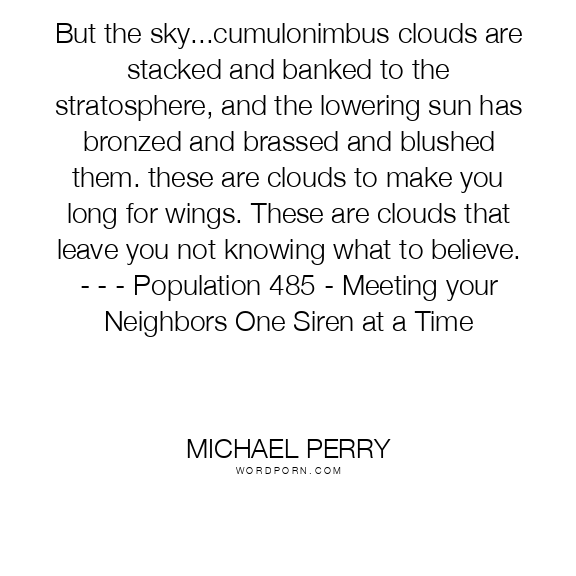 But the sky...cumulonimbus clouds are stacked and banked to the stratosphere, and the lowering sun has bronzed and brassed and blushed them. these are clouds to make you long for wings. These are clouds that leave you not knowing what to believe. - - - Population 485 - Meeting your Neighbors One Siren at a Time