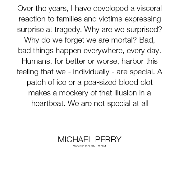 Over the years, I have developed a visceral reaction to families and victims expressing surprise at tragedy. Why are we surprised? Why do we forget we are mortal? Bad, bad things happen everywhere, every day. Humans, for better or worse, harbor this feeling that we - individually - are special. A patch of ice or a pea-sized blood clot makes a mockery of that illusion in a heartbeat. We are not special at all