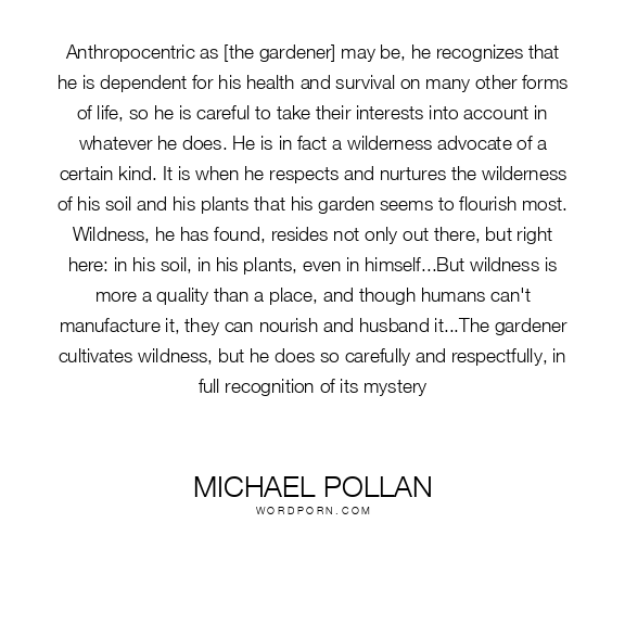 Anthropocentric as [the gardener] may be, he recognizes that he is dependent for his health and survival on many other forms of life, so he is careful to take their interests into account in whatever he does. He is in fact a wilderness advocate of a certain kind. It is when he respects and nurtures the wilderness of his soil and his plants that his garden seems to flourish most. Wildness, he has found, resides not only out there, but right here: in his soil, in his plants, even in himself...But wildness is more a quality than a place, and though humans can't manufacture it, they can nourish and husband it...The gardener cultivates wildness, but he does so carefully and respectfully, in full recognition of its mystery