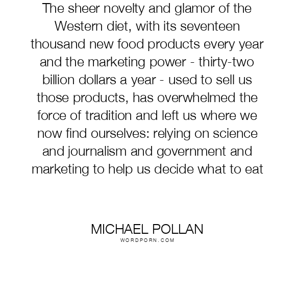 The sheer novelty and glamor of the Western diet, with its seventeen thousand new food products every year and the marketing power - thirty-two billion dollars a year - used to sell us those products, has overwhelmed the force of tradition and left us where we now find ourselves: relying on science and journalism and government and marketing to help us decide what to eat