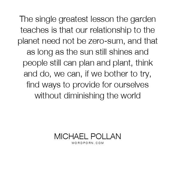 The single greatest lesson the garden teaches is that our relationship to the planet need not be zero-sum, and that as long as the sun still shines and people still can plan and plant, think and do, we can, if we bother to try, find ways to provide for ourselves without diminishing the world
