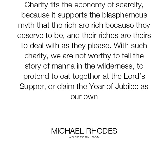 Charity fits the economy of scarcity, because it supports the blasphemous myth that the rich are rich because they deserve to be, and their riches are theirs to deal with as they please. With such charity, we are not worthy to tell the story of manna in the wilderness, to pretend to eat together at the Lord’s Supper, or claim the Year of Jubilee as our own