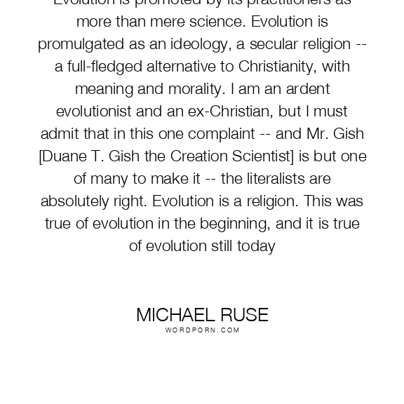 Evolution is promoted by its practitioners as more than mere science. Evolution is promulgated as an ideology, a secular religion -- a full-fledged alternative to Christianity, with meaning and morality. I am an ardent evolutionist and an ex-Christian, but I must admit that in this one complaint -- and Mr. Gish [Duane T. Gish the Creation Scientist] is but one of many to make it -- the literalists are absolutely right. Evolution is a religion. This was true of evolution in the beginning, and it is true of evolution still today