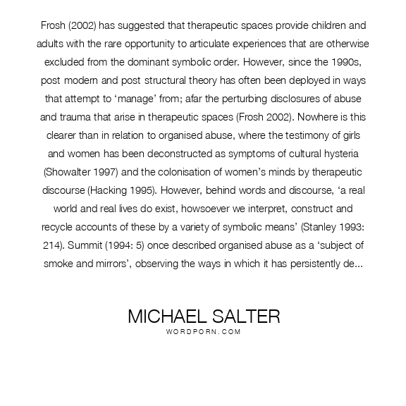 Frosh (2002) has suggested that therapeutic spaces provide children and adults with the rare opportunity to articulate experiences that are otherwise excluded from the dominant symbolic order. However, since the 1990s, post-modern and post-structural theory has often been deployed in ways that attempt to ‘manage’ from; afar the perturbing disclosures of abuse and trauma that arise in therapeutic spaces (Frosh 2002). Nowhere is this clearer than in relation to organised abuse, where the testimony of girls and women has been deconstructed as symptoms of cultural hysteria (Showalter 1997) and the colonisation of women’s minds by therapeutic discourse (Hacking 1995). However, behind words and discourse, ‘a real world and real lives do exist, howsoever we interpret, construct and recycle accounts of these by a variety of symbolic means’ (Stanley 1993: 214). Summit (1994: 5) once described organised abuse as a ‘subject of smoke and mirrors’, observing the ways in which it has persistently defied conceptualisation or explanation. Explanations for serious or sadistic child sex offending have typically rested on psychiatric concepts of ‘paedophilia’ or particular psychological categories that have limited utility for the study of the cultures of sexual abuse that emerge in the families or institutions in which organised abuse takes pace. For those clinicians and researchers who take organised abuse seriously, their reliance upon individualistic rather than sociological explanations for child sexual abuse has left them unable to explain the emergence of coordinated, and often sadistic, multi—perpetrator sexual abuse in a range of contexts around the world