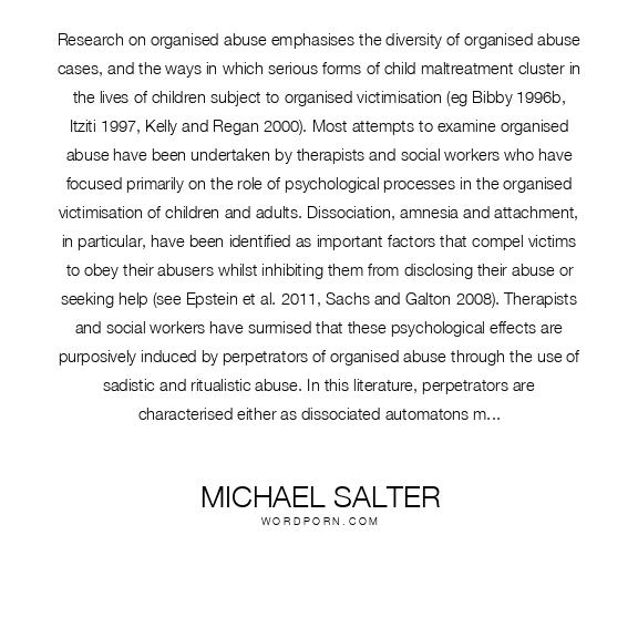 Research on organised abuse emphasises the diversity of organised abuse cases, and the ways in which serious forms of child maltreatment cluster in the lives of children subject to organised victimisation (eg Bibby 1996b, Itziti 1997, Kelly and Regan 2000). Most attempts to examine organised abuse have been undertaken by therapists and social workers who have focused primarily on the role of psychological processes in the organised victimisation of children and adults. Dissociation, amnesia and attachment, in particular, have been identified as important factors that compel victims to obey their abusers whilst inhibiting them from disclosing their abuse or seeking help (see Epstein et al. 2011, Sachs and Galton 2008). Therapists and social workers have surmised that these psychological effects are purposively induced by perpetrators of organised abuse through the use of sadistic and ritualistic abuse. In this literature, perpetrators are characterised either as dissociated automatons mindlessly perpetuating the abuse that they, too, were subjected to as children, or else as cruel and manipulative criminals with expert foreknowledge of the psychological consequences of their abuses. The therapist is positioned in this discourse at the very heart of the solution to organised abuse, wielding their expertise in a struggle against the coercive strategies of the perpetrators. Whilst it cannot be denied that abusive groups undertake calculated strategies designed to terrorise children into silence and obedience, the emphasis of this literature on psychological factors in explaining organised abuse has overlooked the social contexts of such abuse and the significance of abuse and violence as social practices